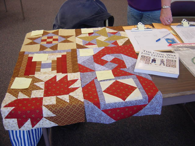 | Susan Palmer has already made six blocks for her sampler. They are... Back Row: left, Variable Star; right, Shots at Ft. Sumpter. Middle Row: left, Courthouse Steps; right, Monkey Wrench (not the same as the one being taught). Front Row: left, Bear Paws; right, VMI Block (also not taught). 2/23/10 |