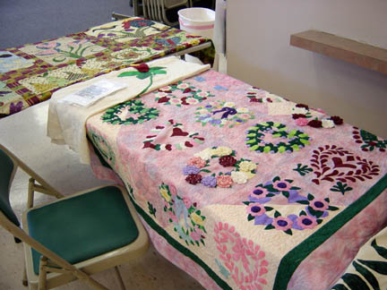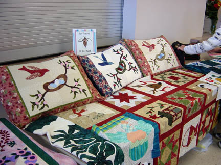| "Stitches in Time" is an applique bee led by Kinza Pickelsimer. This year members worked on a Pat Sloan patterned pillow and a 12 block applique quilt designed by Tin Fisher. Members of the bee are Karen Arends, Bette Gove, Kinza Pickelsimer, Linda Pote, Marie Schoepke, Ann Whalen, Peggy White, and Tina Fisher. This bee is open to new members wishing to practice their applique skills. |