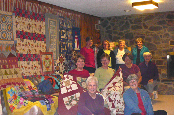 | Each year in January the Material Girls Bee goes on a retreat. This year the Material Girls spent a week sewing in Fredericksburg, VA. At the end of the week they assembled all their projects, which totaled approximately 70, and took a picture. However, all projects could not fit into the frame! (Information submitted by Stephanie Schaefer) |