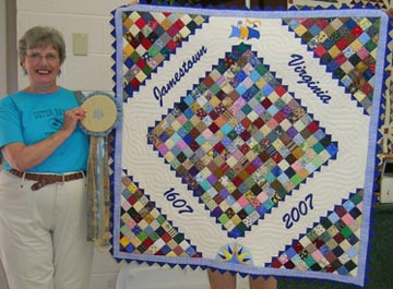 Our own Jean Hensley won the General Commemorative Quilt category for her quilt "Charming Jamestown." The quilt was entered in the Jamestown Commemorative Quilt Contest sponsored by Old Trinity Schoolhouse Quilt Shop. The show and contest took place on July 27, 2007. Jean is the Lake Quilters Guild Historian. All the winners and show highlights can be currently viewed on the Trinity Schoolhouse website at http://www.trinityquilts.com/content.php?content_id=55 |