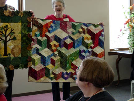 | Our 2007 Challenge leader was Sandra Ferguson. The theme was "Think Outside the Box." When the Material Girls first thought of this theme, they thought it should only be about creating innovative borders. However, the concept was soon expanded to include the entire quilt, not just the borders. The quilter was free to interpret the theme in her own personal way. The challenge projects were displayed at the December Luncheon. Below are the winning entries. Members voted on the entries by secret ballot. View a slide show of all the entries (click here). |