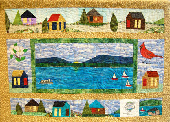 | This SML Home Tour Wall Hanging was made by members of the Kept in Stitches and Sunshine Bees and presented to Denise Tuttle, Executive Chair of SML Charity Home Tour at our May 2015 General Meeting. The quilt honors the 25th Anniversary of both the Home Tour and Lake Quilters Guild. Tuttle plans to display the wall hanging during volunteer training for the Home Tour. |