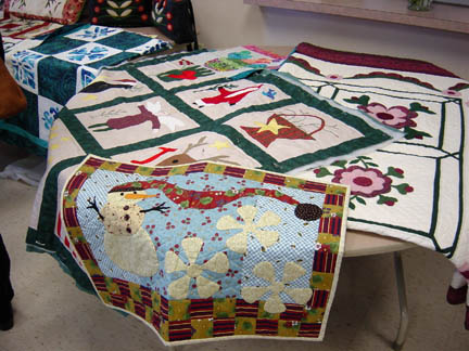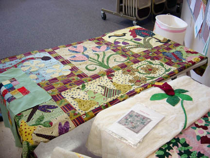 | "Stitches in Time" is an applique bee led by Kinza Pickelsimer. This year members worked on a Pat Sloan patterned pillow and a 12 block applique quilt designed by Tin Fisher. Members of the bee are Karen Arends, Bette Gove, Kinza Pickelsimer, Linda Pote, Marie Schoepke, Ann Whalen, Peggy White, and Tina Fisher. This bee is open to new members wishing to practice their applique skills. |