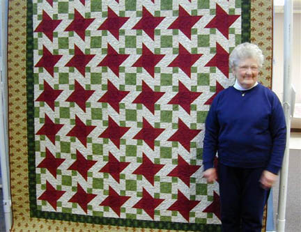 | The drawing for the 2006 Quilt Show Raffle Quilt was held on Saturday, March 25th at 3 p.m.during the quilt show. This is quilt is queen size quilt and the pattern is known as "Waterwheel." The quilt was designed and assembled by Velma Meador, Linda Brown, Tina Fisher, Ruth Ann Assaid and Mary Johnson. LQG members made the individual blocks. |