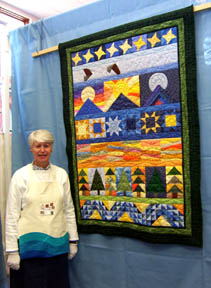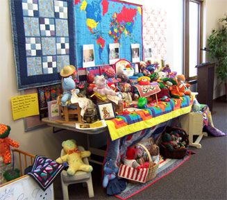 | Shown above is the Community Service table with display of charity bears and quilts made by guild members. | Above, Sharon Pafford stands before her quilt "America the Beautiful." This quilt design was the guild Block of the Month project for 2003. |