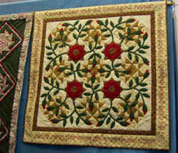 | LQG Members.... can you tell me something about this quilt/booth? Email the Webmaster Sandra Ferguson has written in to say that the quilt on the right is hers. It's called Hollow Blocks and was made for her granddaughter, Lauren Fergnson. | Written around the outside border of this quilt is "Remember me at twilight hour / When all around seems sweet and fair / When mirth and jest have lost their power / O! I would be remembered there!" |